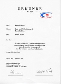Durch Schulungsmaßnahmen der Qualitätsgemeinschaft Sicherungstechnik Nord (QSN), welche nach dem Anforderungsprofil des Bayrischen Landeskriminalamtes durchgeführt wurde, ist unser Unternehmen in der Errichterliste der Kriminalpolizei aufgeführt. Wir können Sie im Bezug auf mechanische Sicherungseinrichtungen beraten und entsprechende Montagen, zur Sicherung Ihres Eigentumes, nach Vorgaben der Errichterliste, vornehmen.